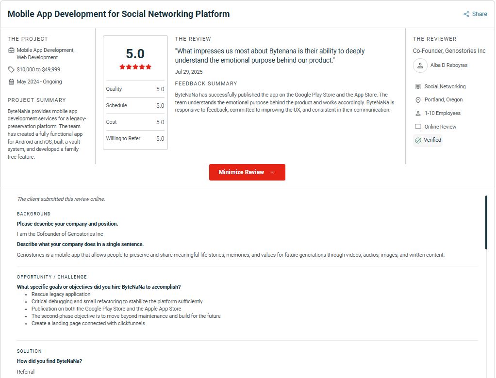 We took over the bug-ridden GenoStories legacy project, performing critical fixes that enabled its successful publication on both the Google Play and Apple App Stores. The app preserves family history through social features like a timeline, live streaming, and shareable vaults. We are now preparing for Phase 2: a complete rework for scalability, featuring a new custom payment gateway, deep integration with Ancestry.com with app’s Family Tree and also an AI Chatbot!